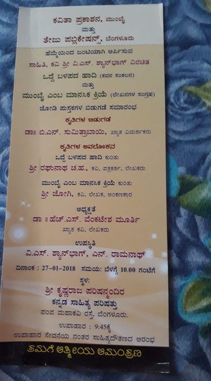 ವಿ. ಎಸ್.ಶ್ಯಾನ್ ಭಾಗ್ ಅವರ " ಒದ್ದೆ ಬಳಪದ ಹಾದಿ " ಬಿಡುಗಡೆ -27-1-2018
